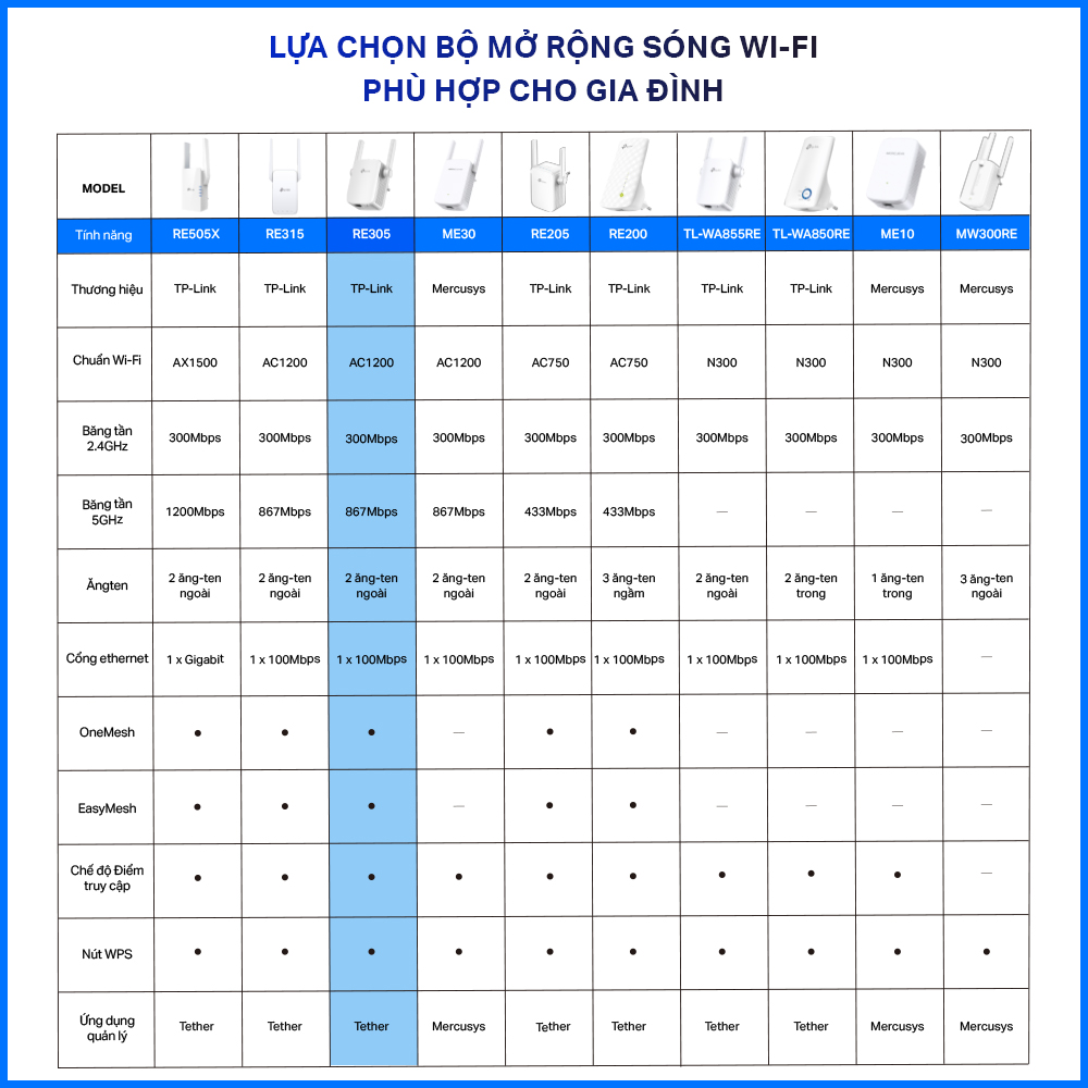 | Phụ kiện đi kèm | Bộ Mở Rộng Sóng Wi-Fi AC1200 RE305Hướng dẫn cài đặt nhanh |