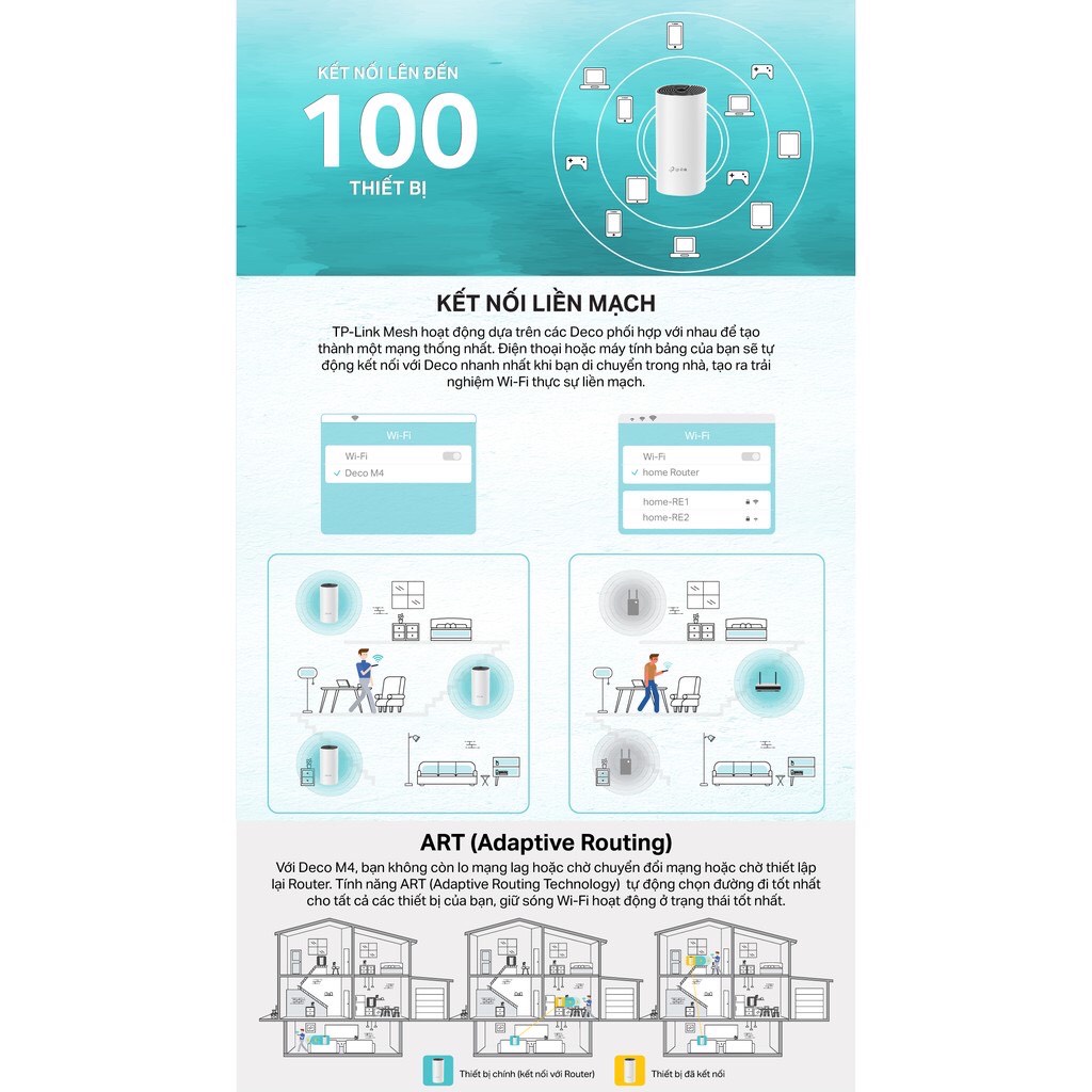 Công nghệ Mesh Deco tiên tiến, các thiết bị phối hợp với nhau để tạo thành một mạng thống nhất với một tên mạng duy nhất. Các thiết bị tự động chuyển đổi giữa các Deco khi bạn di chuyển trong nhà để có tốc độ nhanh nhất.
